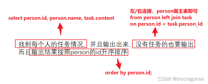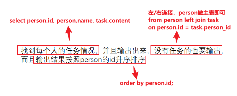 找到每个人的任务情况,并且输出出来,没有任务的也要输出,而且输出结果按照person的id升序排序,输出情况如下: