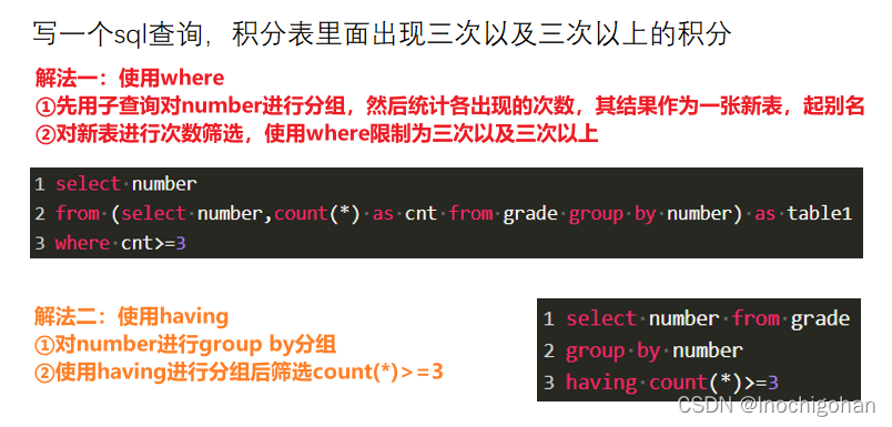 写一个sql查询,积分表里面出现三次以及三次以上的积分,查询结果如下: