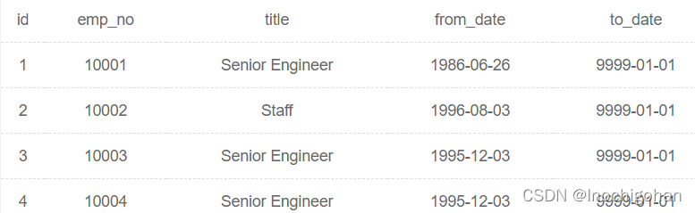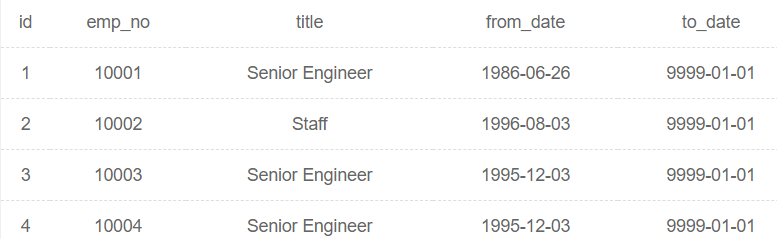 删除emp_no重复的记录,只保留最小的id对应的记录。删除后titles_test表为(注:最后会select * from titles_test表来对比结果)