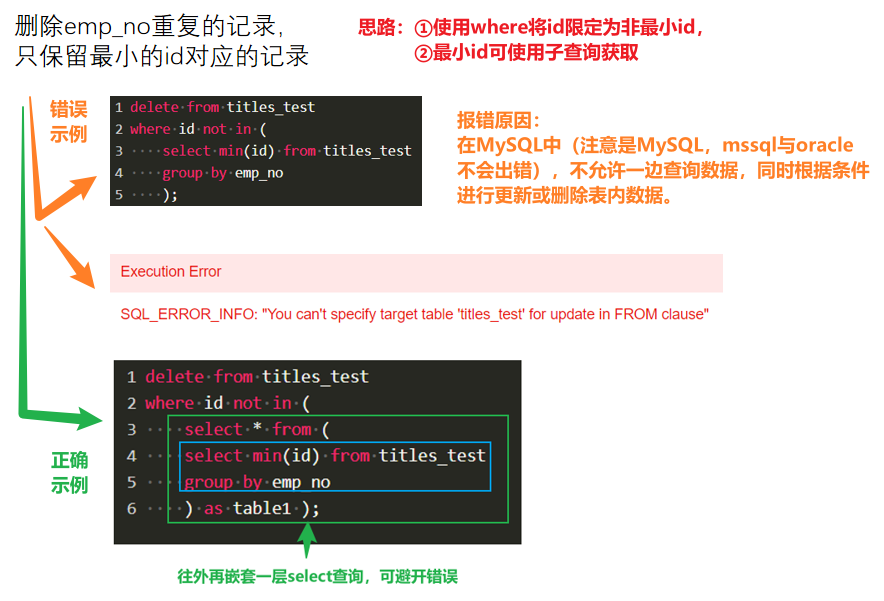 不然会报错:SQL_ERROR_INFO:"You can‘t specify target table 'titles_test' for update in FROM clause"
