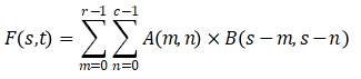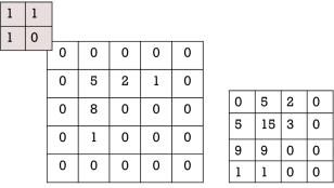 此公式是由一维的卷积公式扩展而来,对于图像而言,离散卷积的计算过程是模板翻转,然后在原图像上滑动模板,把对应位置上的元素经过处理,得到最终的结果[2]。我们来看一种更直观的对于卷积的理解方法——相乘相加,如下图2-8所示,图左表示一张原图像,也即上述公式的A矩阵,图右表示卷积核,也即公式里的值做了180°翻转的B矩阵。