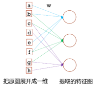 同时,我们可以用下图2-13来理解前一个隐藏层和后一个隐藏层的图像元素之间是怎么连接的。如图2-13所示,左边方框内的字母代表原始图像中的二维矩阵元素展开成一维的数据,经过卷积操作后得到右边的圆形,这个操作所带有的卷积核值以某种方式将权重信息带到右边部分,也即输出的特征图。