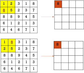 举个例子,如下图2-20所示,无论左边的两张图中窗口里最大值位置怎么变化,到最后进行池化的时候,最大值被抽取出来,细节的位置信息被忽略,但特征被强调了,输出的图都是相同的。