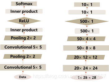 本文在.prototxt上选取了几个部分,显示的是LeNet里面的几个典型的层,比如池化层,激活层,最后计算误差的层。