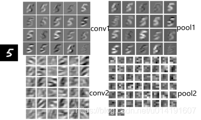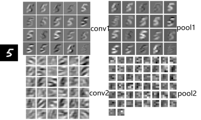在上一小节里,我们知道了网络描述文件里对应的LeNet是怎么样部署的,但仅此还不够,对于整个网络的图像数据流动,我们尚不清楚。因此,本节尝试运行一个提前编写好的可视化程序,对应着这个模型,使用ipython notebook把每一层的输出的特征图、池化图,都显示出来。如图2-35所示。