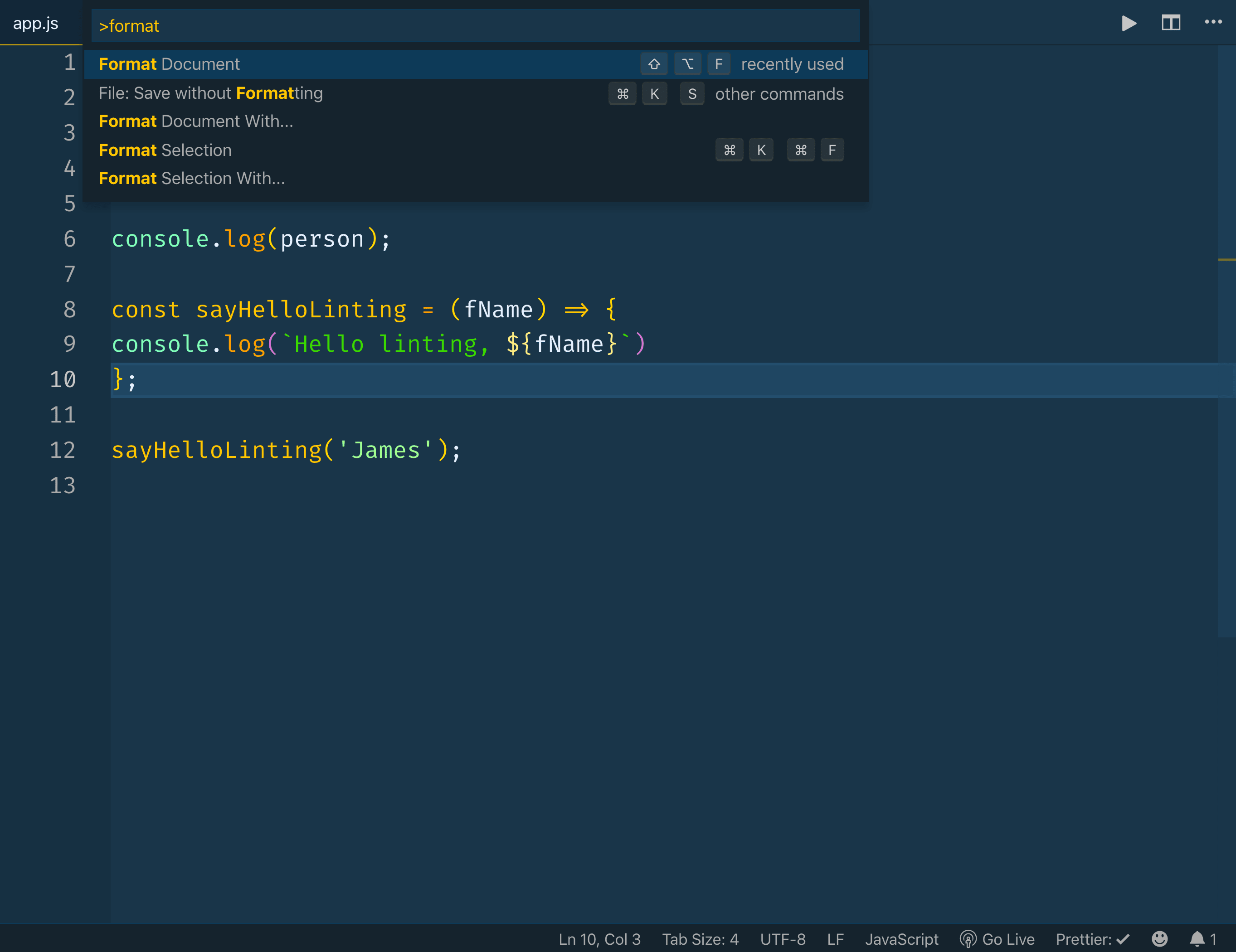 With the Prettier extension installed, we can now leverage it to format our code. We'll work more on this later, but to start, we can use the Format Document command.