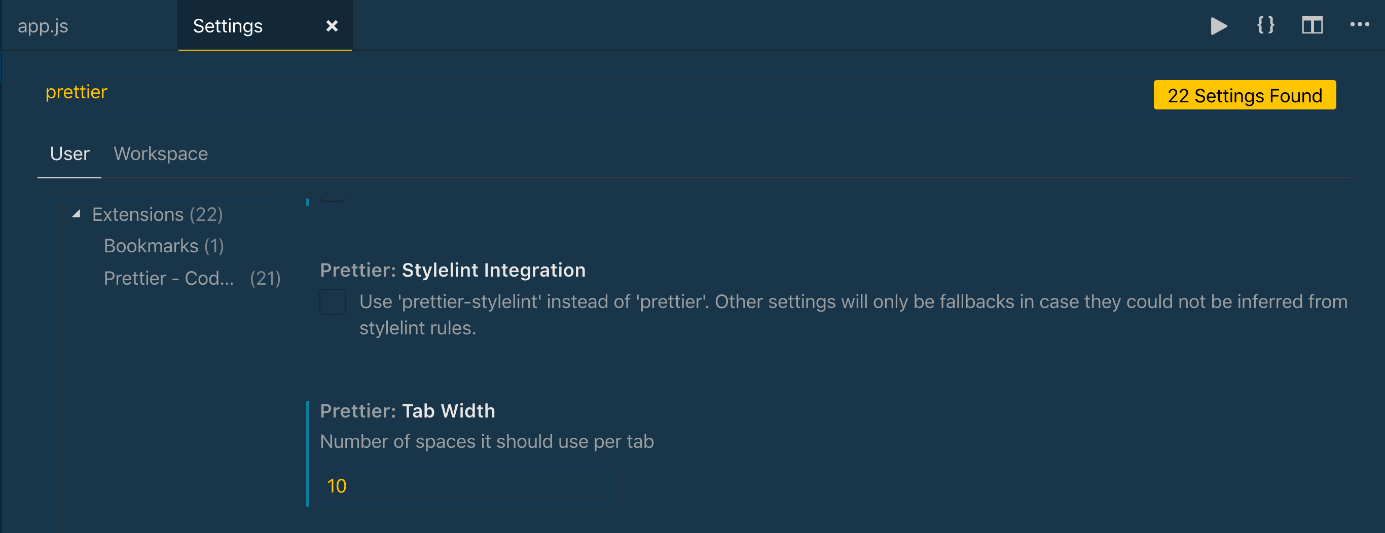 如上打开设置菜单。 然后,搜索Prettier 。 这将显示所有可以在编辑器中更改的设置。