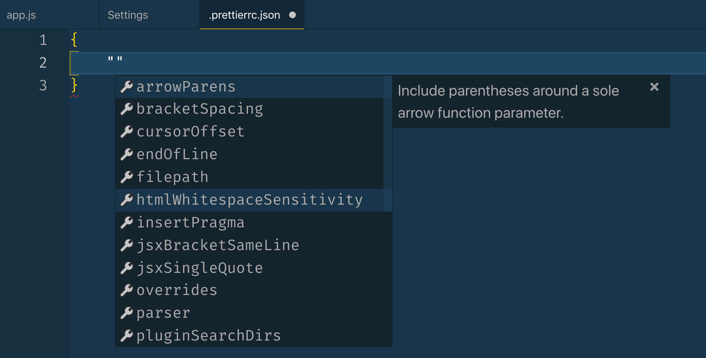 To solve this, you can create a Prettier configuration file. It has to be titled .prettierrc.(ext) with one of the following extensions.