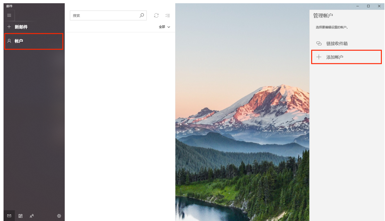 启动 Win10 邮件客户端,选择左侧"账户",点击右侧"添加帐户"。
