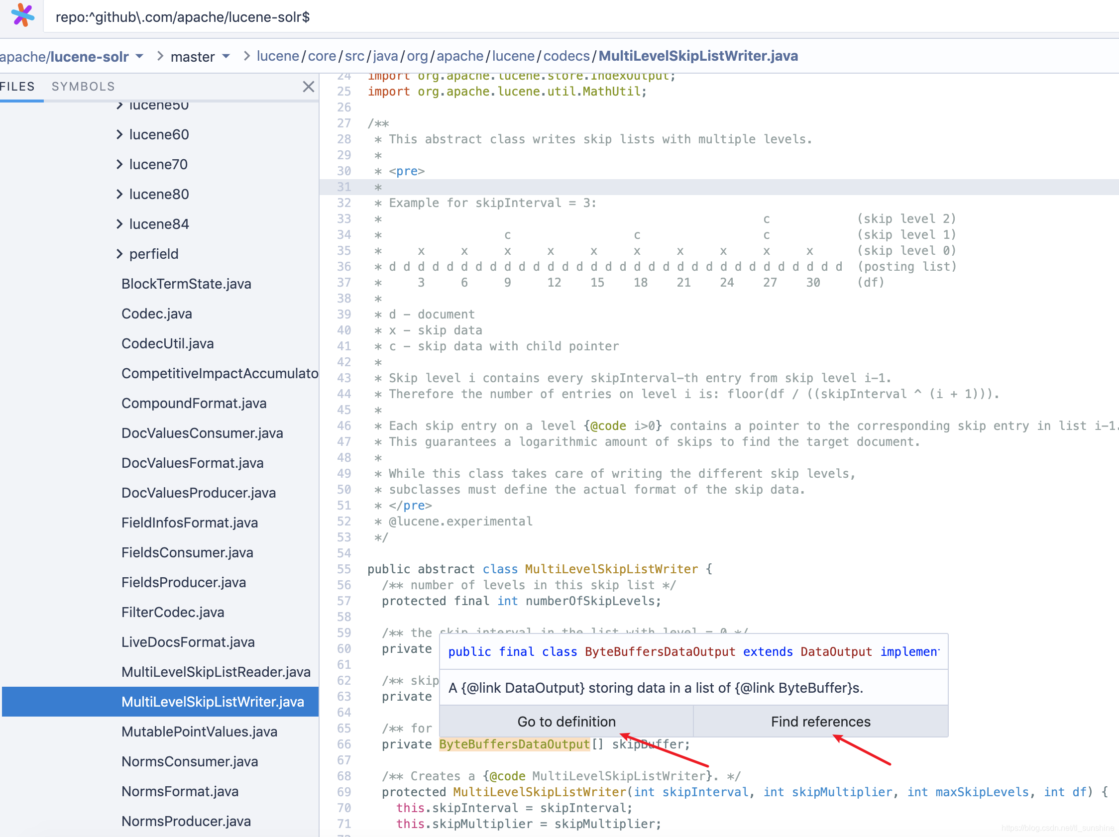 进入某个路径下面的某个文件,点击某个符号后出现下图,很方便就能找到定义和引用的位置了