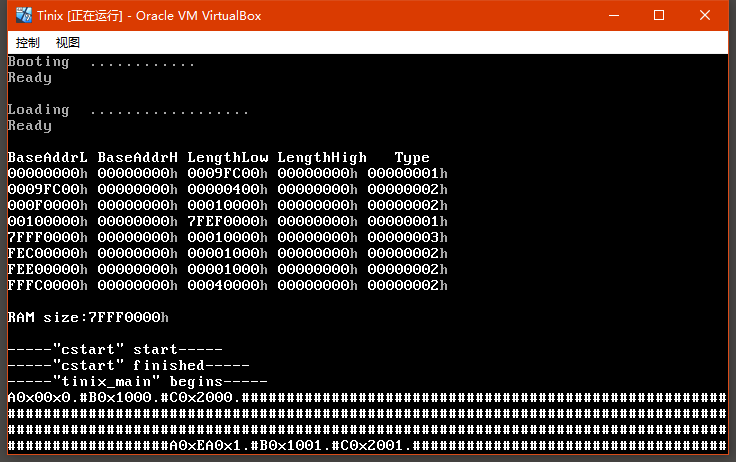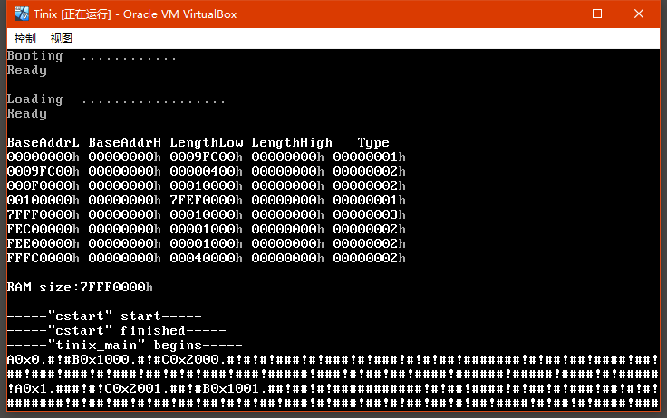可以看到打印了很多 "!" ,这是因为在 get_ticks 中断调用函数的过程中有时钟中断重入的情况!所以这里我们要注意,时钟中断的发生次数等于 "!" + "#" 的次数和,只是 "!" 因为 get_ticks 的原因视此次中断无效!