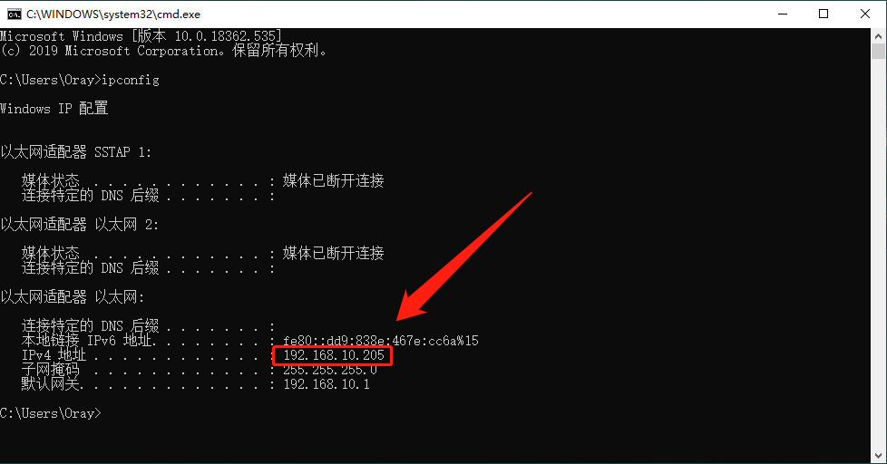 检测发现8080端口可用,点击确定即可;然后查看OA服务器的IP地址(后面映射需用到):Windows+R快捷键打开“运行”窗口,输入“CMD”,在命令行里输入ipconfig回车,即可看到本机内网IP;