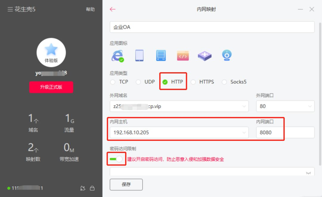 花生壳客户端还新增“密码访问限制”,保护公司内网应用免受无关人员访问,设置访问密码后,后期外网登录OA前需先输入访问密码;