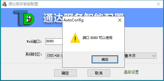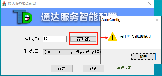 安装成功后会弹出服务智能配置界面,“Web端口”默认为80,点击“端口检测”发现80端口已被占用,这里修改为8080;