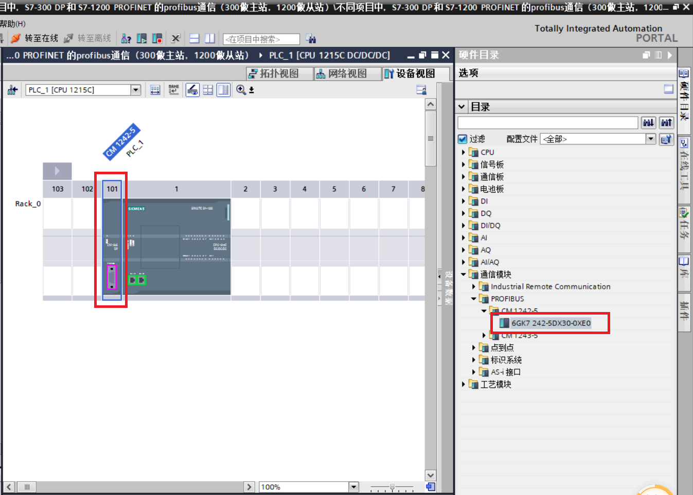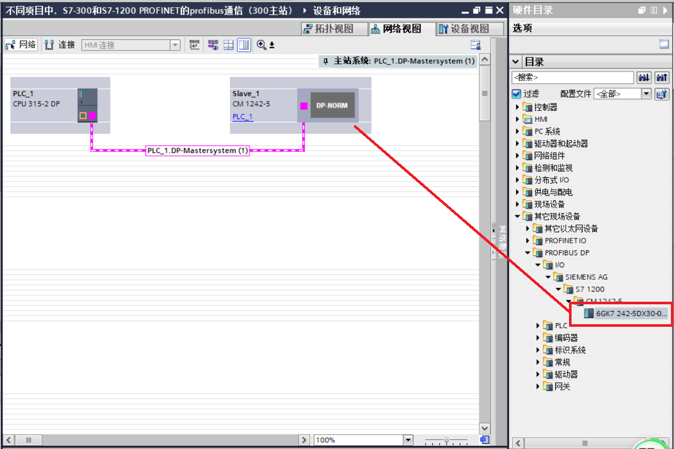 3)、接着在主站项目中组态从站,在网络视图中,将 CM1242-5 从“选件”中拖拽并放入到网络视图中。
