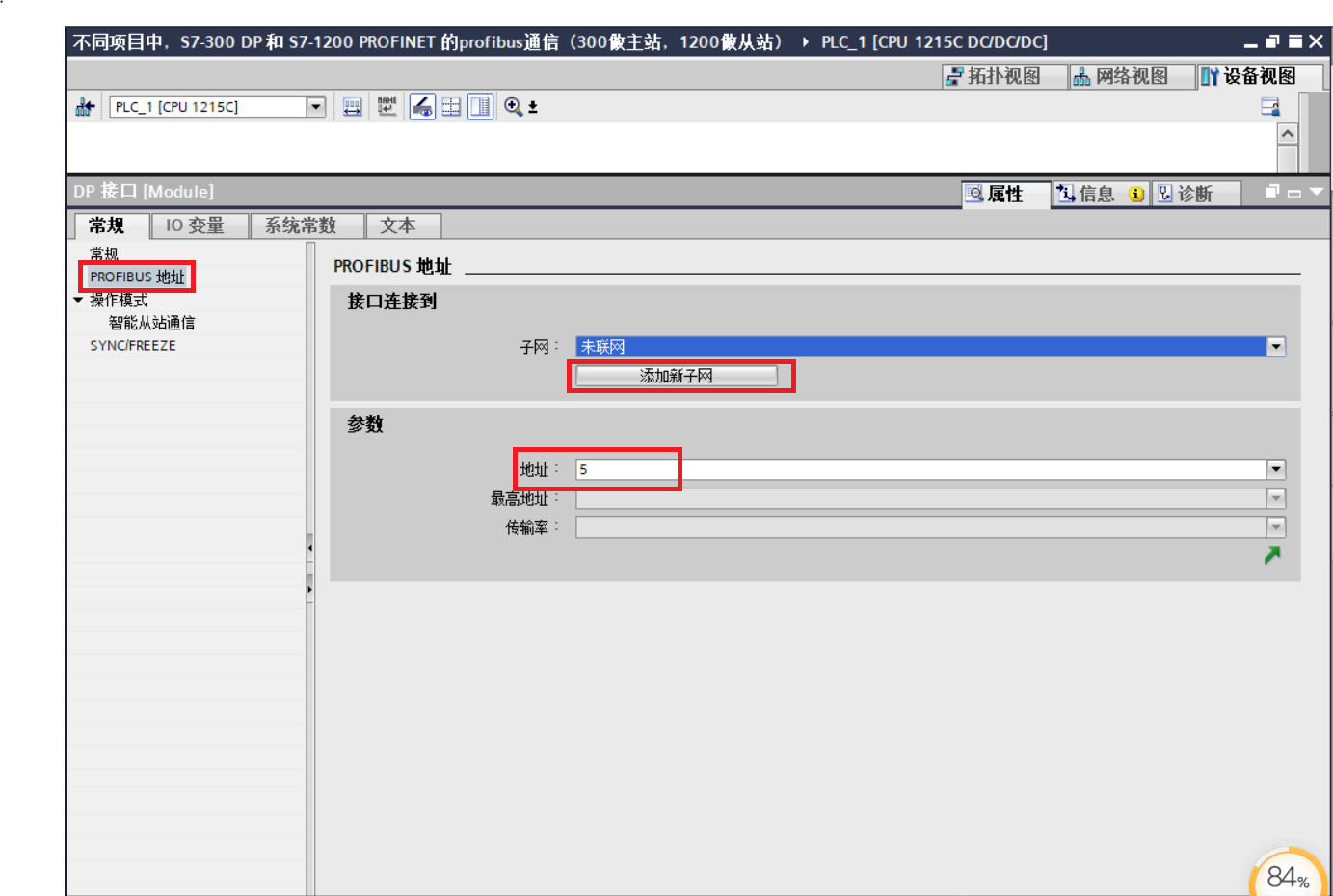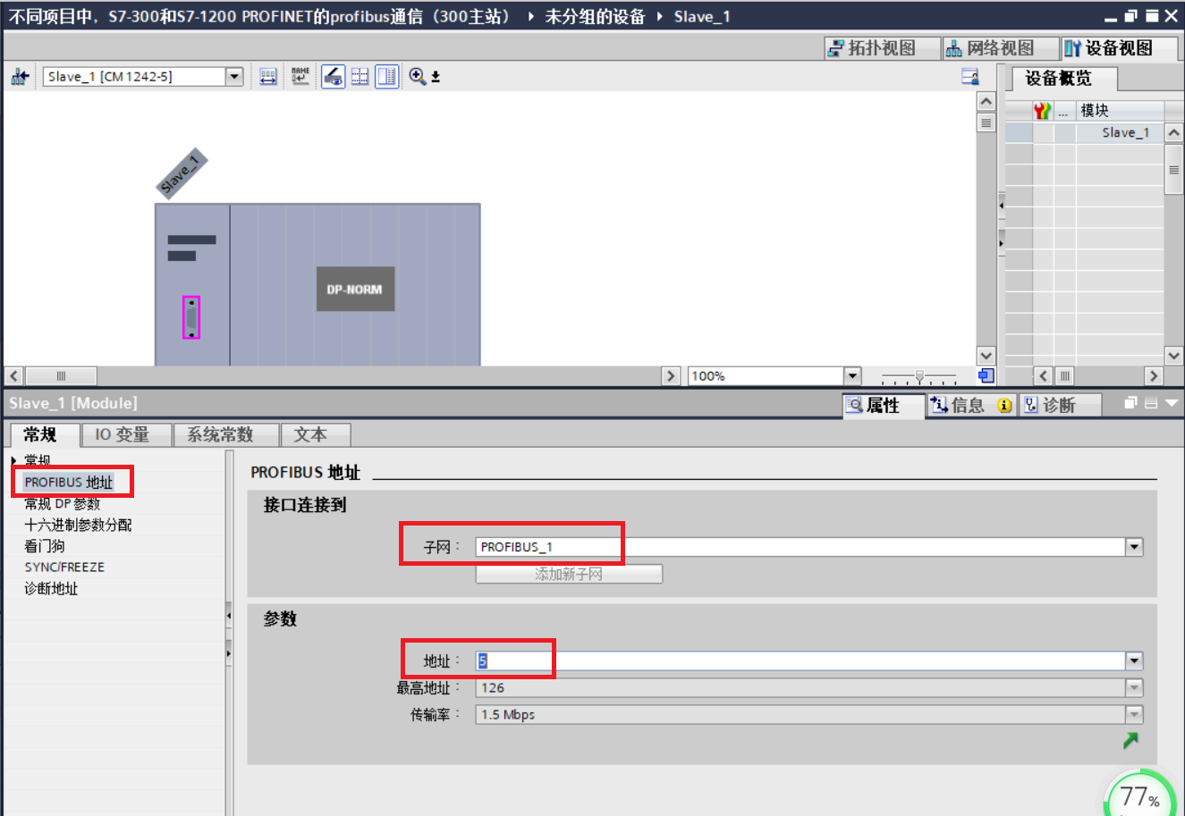 4)、进入 CM1242-5(slave_1)的设备视图,进入设备的属性框中,【子网】选择“PROFIBUS_1”,【地址】选择 5;