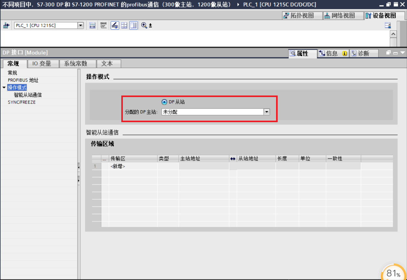 3)、【操作模式】界面,选择【DP 从站】,【分配的 DP 主站】选择“未分配”;