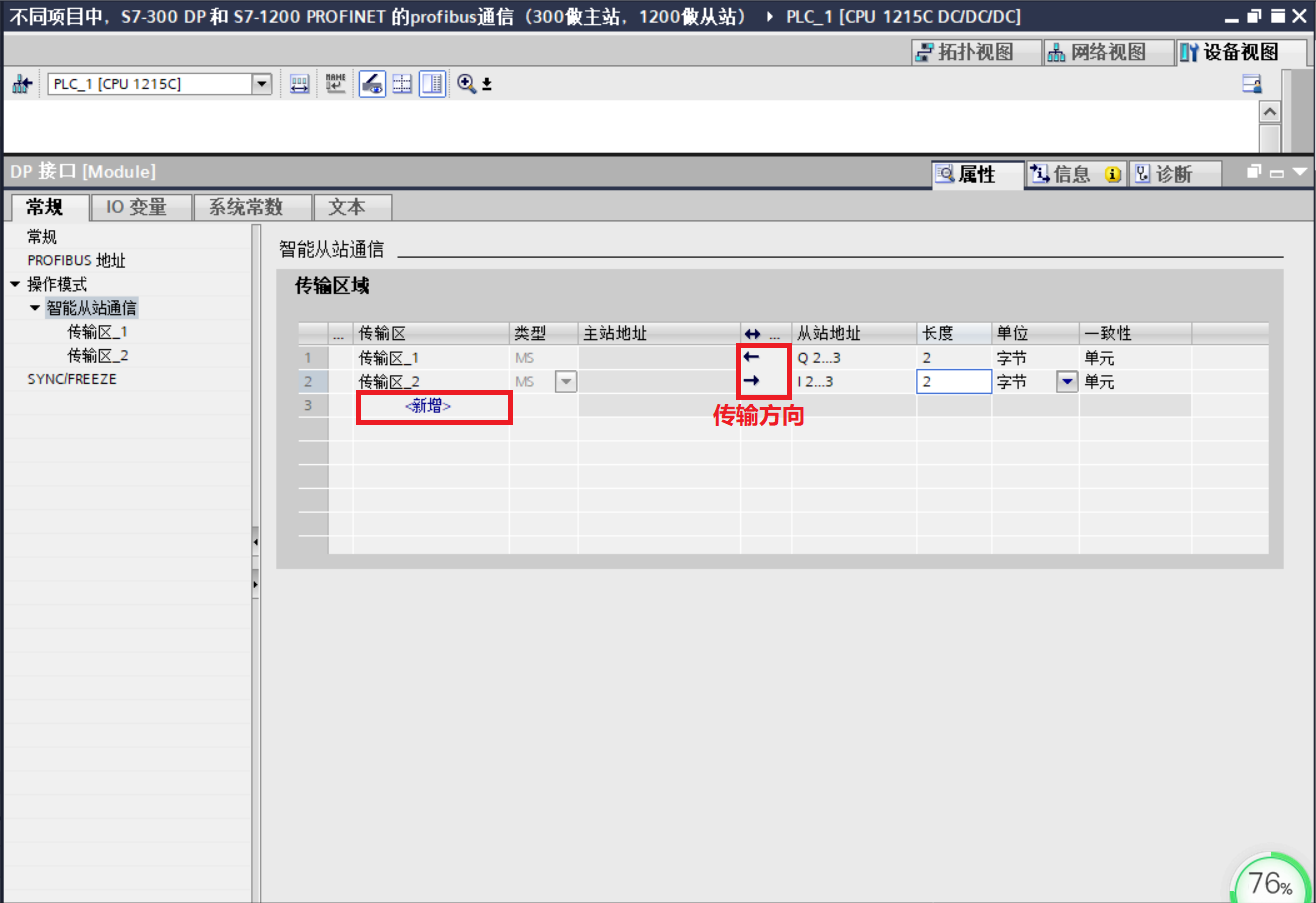 4)、【智能从站通信】界面,双击【新增】,传输区域添加 2 个传输区(“传输区_1”、“传输区_2”),数据长度都是 2个,单位都是字节。“传输区_1”设置为输出,单击传输方向的箭头使之朝向左侧方向,起始地址设置为2;“传输区_2”设置为输入,单击传输方向的箭头使之朝向右侧方向,起始地址设置为2;(“传输区_1”和“传输区_2”既可以设置为输入和输出,也可以设置为输出和输入)