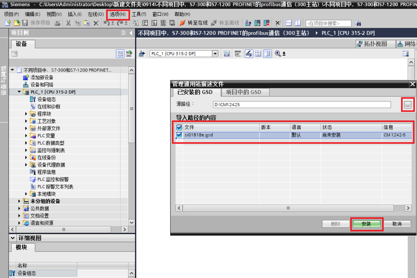 2)、通过【选项】进入【安装设备描述文件】界面, 在源路径选择 CM1242-5 的 GSD 文件存放路径。注意:源路径中不能有中文字符。