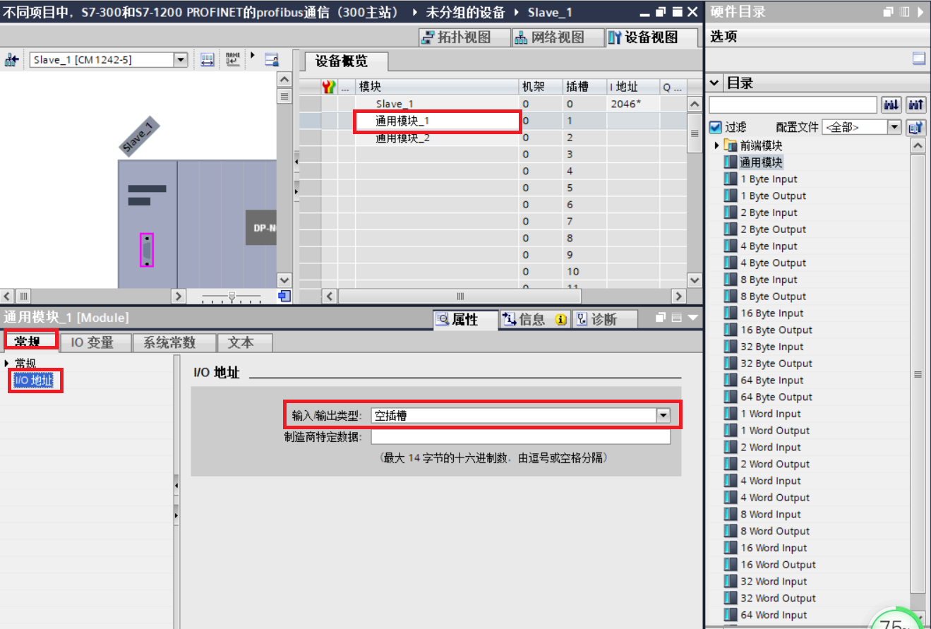 6)、设置“通用模块_1”,【属性】➡【常规】➡【I/O地址】,【输入/输出类型】选择“输入”(因为从站的第一个模块选择的是输出);