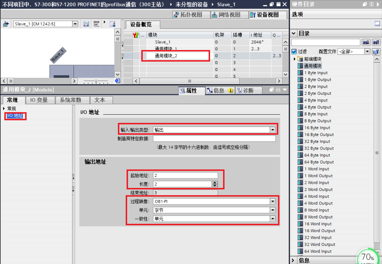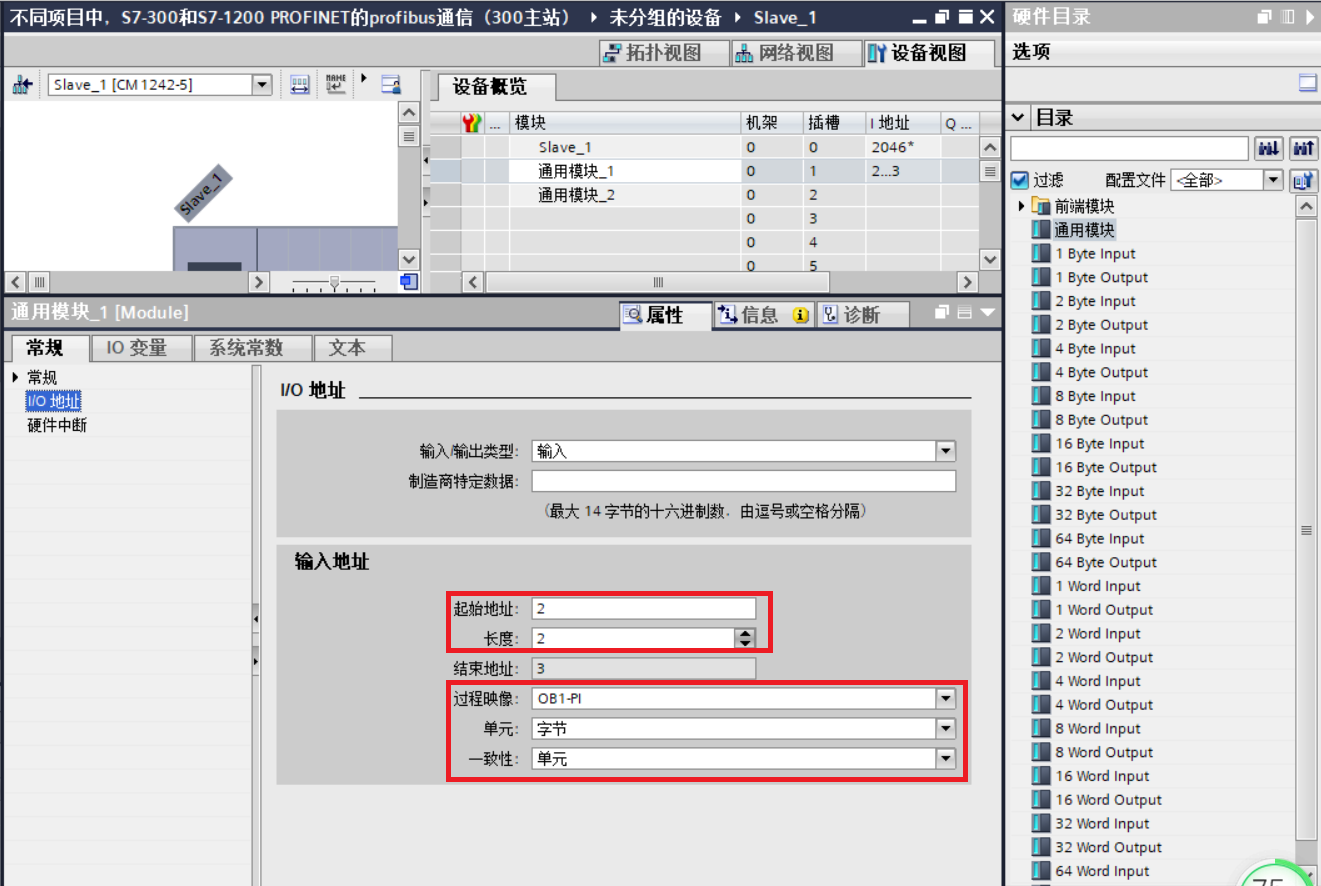 7)、设置【起始地址】为“2”,【长度】为2(与从站长度必须保持一致),【单元】为“字节”;同理设置“通用模块_2”为输出;