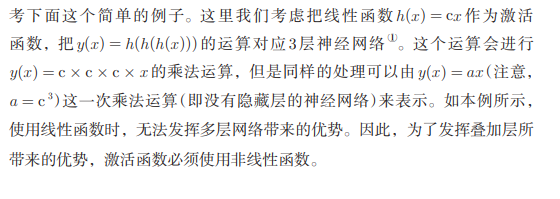 神经网络的激活函数必须使用非线性函数,如果不使用非线性函数,加深神经网络的层数就毫无意义了。线性函数的问题在于,不管如何加深层数,总是存在与之等效的“无隐藏层的神经网络”。