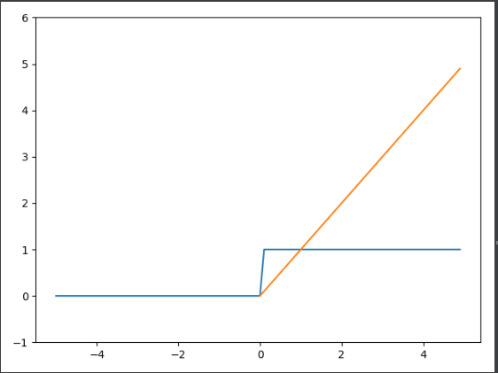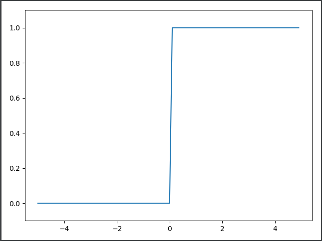 如上图所示,阶跃函数以0为界,输出从0切换为(或者从1切换为0)。它的值呈阶梯式变化,所以称为阶跃函数。