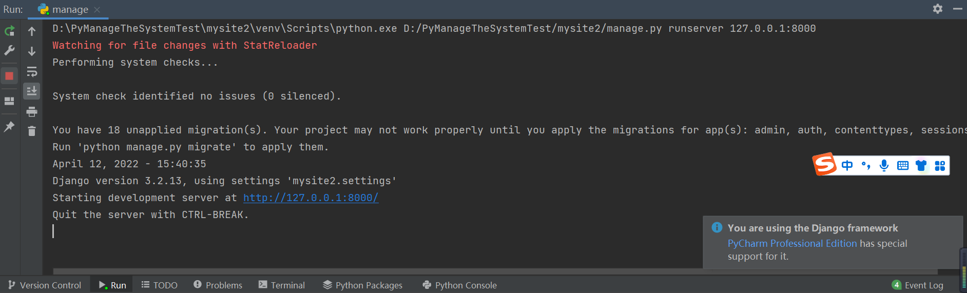 终端下运行 “ python manage.py runserver ” Pycharm 没弹出网址 /