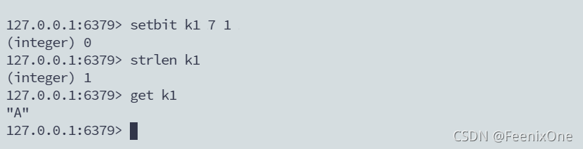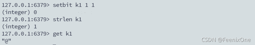 当执行setbit k1 1 1这个命令的时候,k1是key的名字这个不用多说,第一个1指的是二进制中从左向右偏移1位,第二个1指的是值设为1,也就是创建了01000000这个值。那么,k1用strlen获取的长度是多少?值又是什么?