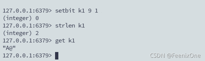 没错,此时k1的长度就是2个字节了,因为9已经超过了1个字节的长度了。那么k1的值是多少?是A@。因为Redis在读取值的时候是按照一个字节一个字节读取出来的,setbit k1 9 1,得到了这么两个二进制数:01000001 01000000,那么相应读取出来的就是两个字节的值。