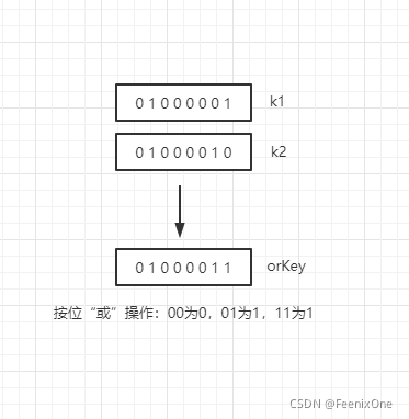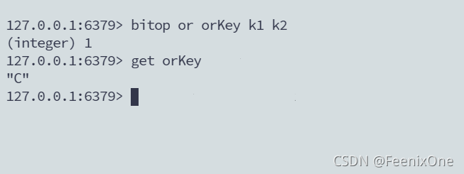 再做“或”运算(有1则1,全0为0),看看是什么:bitop or orKey k1 k2,意思是将k1的值和k2的值进行按位或操作,结果存入orKey中,那么get orKey中的值是多少?没错,就是C。