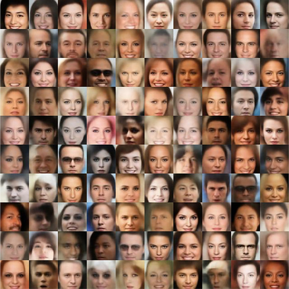 这些由VAE生成的假人脸边缘非常模糊并融合到了背景中。因为CelebA数据集的图像居中且对齐,使眼睛和嘴巴周围的特征保持一致,但是背景往往会有所不同。VAE选择稳妥的方法:通过选择“安全”像素值使背景模糊,这样可以最大限度地减少损失,但不能生成质量良好的图像。