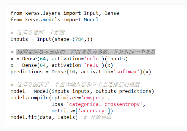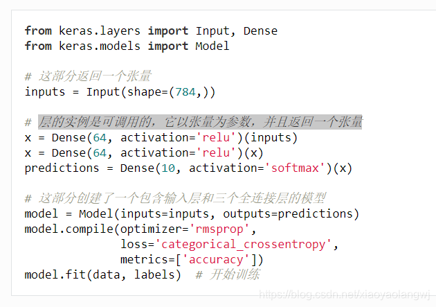 请牢记:Keras函数式API,每一层Layer都是一个张量。只要输入输出满足,就可以连接。每一层作为一个参数直接输入到下一层。