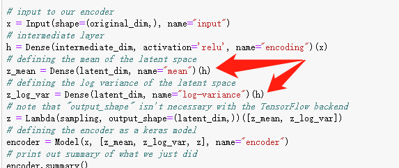 Keras有两种构建model的方式,一种是Sequential贯序式,一种是函数式。Sequential并不适用于分支结构,本例中对样本的均值和方差两个特征加入到潜在空间 z(学习的是均值和方差),存在分支复用,所以用函数式。