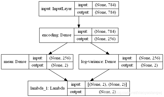 encoder = Model(x, [z_mean, z_log_var, z], name="encoder")encoder的定义指出输入为第一个参数x,输出为[z_mean, z_log_var, z],输出3个值,这看起来好像跟前面有不够协调的地方,仔细Recall一下,我们在连接的时候,选用的是编码器的3rd Layer层,并没有选择这个Lambda层。