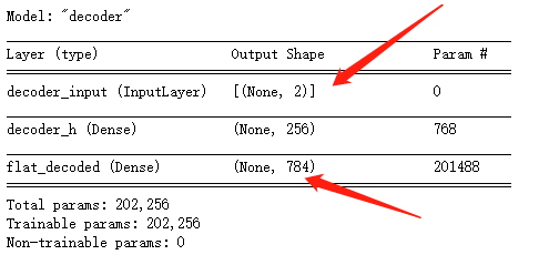 decoder.summary()编码器最终是两个神经元,解码器网络的起始位置就是这两个神经元。