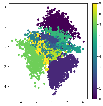 测试集中所有点到潜在空间及其类的二维投影。图上显示的是二维潜在空间。我们映射出这些生成样本的类别,并根据右侧的图例相应地为它们着色。可以看到同一类样本倾向于整齐的分组在一起,这说明是一个很好的表示。