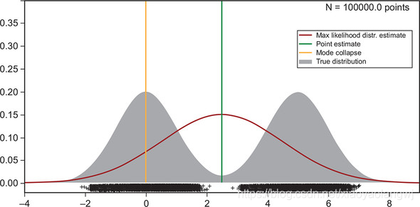 在我们不知道底层的模型长什么样子的情况下,从这个真实的分布中抽取了一堆样本,来推断这些样本的分布情况,一般我们假设真实分布是简单的高斯分布,只需要计算均值和方差即可。这个假设与实际情况不符,甚至说是错误的假设。如果继续使用最大似然估计来估计分布,则为单峰分布——这其实就是VAE在做的事情。此时我们会估计出一个双峰的平均值的正态分布,如图,灰色双峰是真实的,估计分布是中间单峰高斯分布,称为点估计。如下文中将要提到的“安全中间地带”。