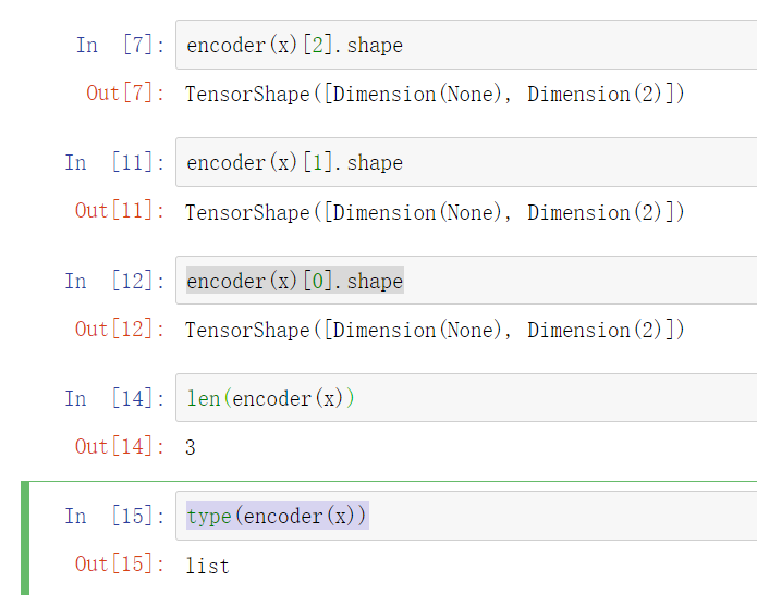 encoder(x)代表将x作为输入Input,输入到编码器定义的Model中,输出为一个长度为3的列表,列表的第三个元素也就是编号[2],代表的是z。二维的z,我在回顾一下编码器中z的定义:z是编码器对输入构建高斯分布之后采样得到的Latent vector。
