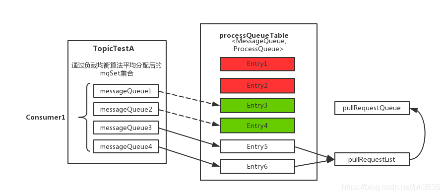 消息消费队列在同一消费组不同消费者之间的负载均衡,其核心设计理念是在一个消息消费队列在同一时间只允许被同一消费组内的一个消费者消费,一个消息消费者能同时消费多个消息队列。