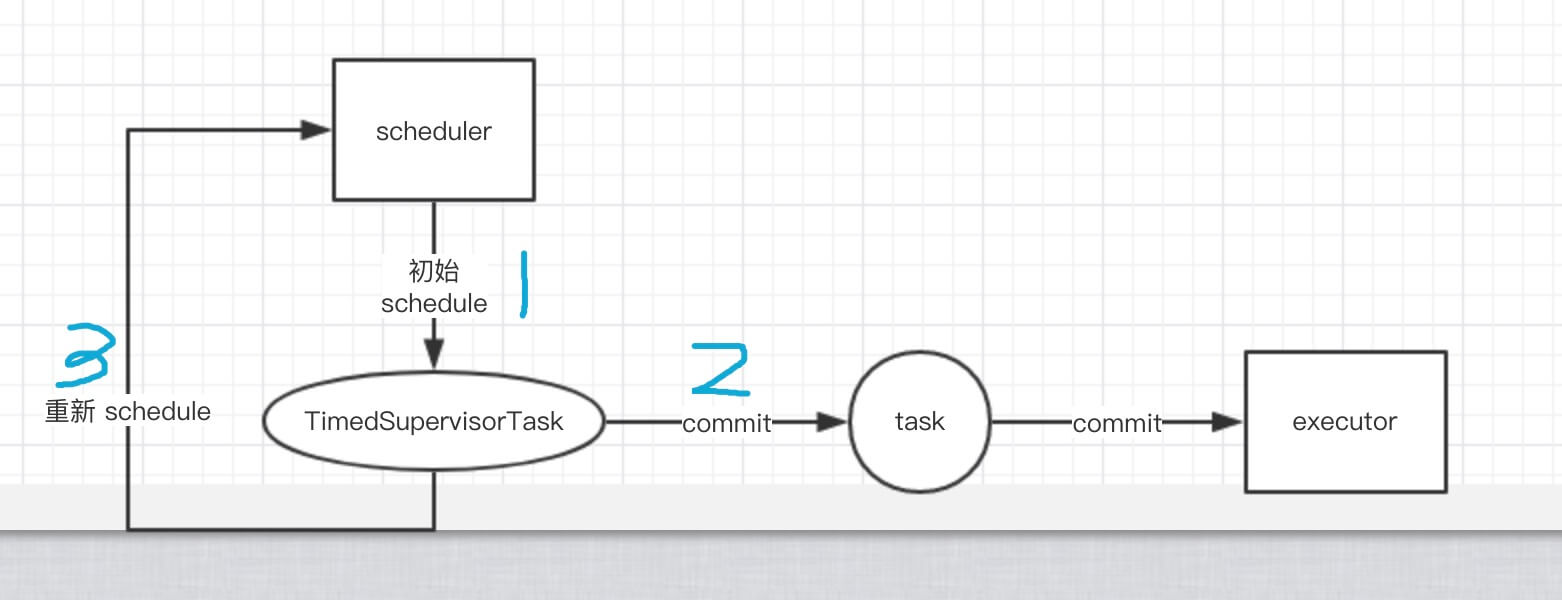 scheduler初始化延迟执行 TimedSupervisorTask 。- TimedSupervisorTask 执行时,提交