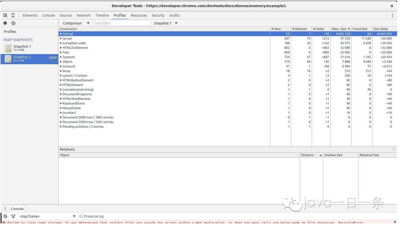 切换到 Chrome Dev Tools 的 profiles 标签,刷新页面,等页面刷新完成之后,点击 Take Heap Snapshot 保存快照作为基准。而后再次点击 The Button 按钮,等数秒以后,保存第二个快照。