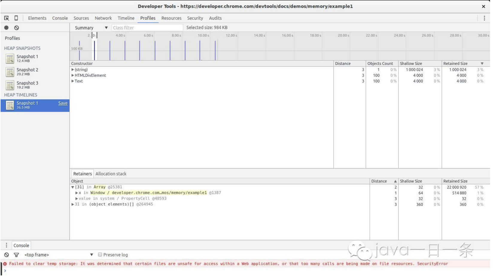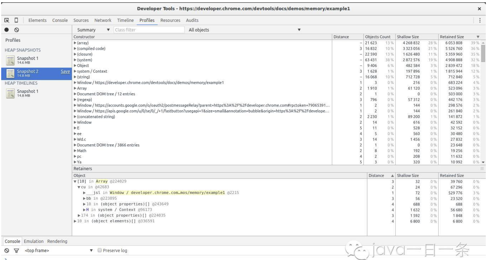 Profiles 是你可以花费大量时间关注的工具,它可以保存快照,对比 JavaScript 代码内存使用的不同快照,也可以记录时间分配。每一次结果包含不同类型的列表,与内存泄露相关的有 summary(概要) 列表和 comparison(对照) 列表。