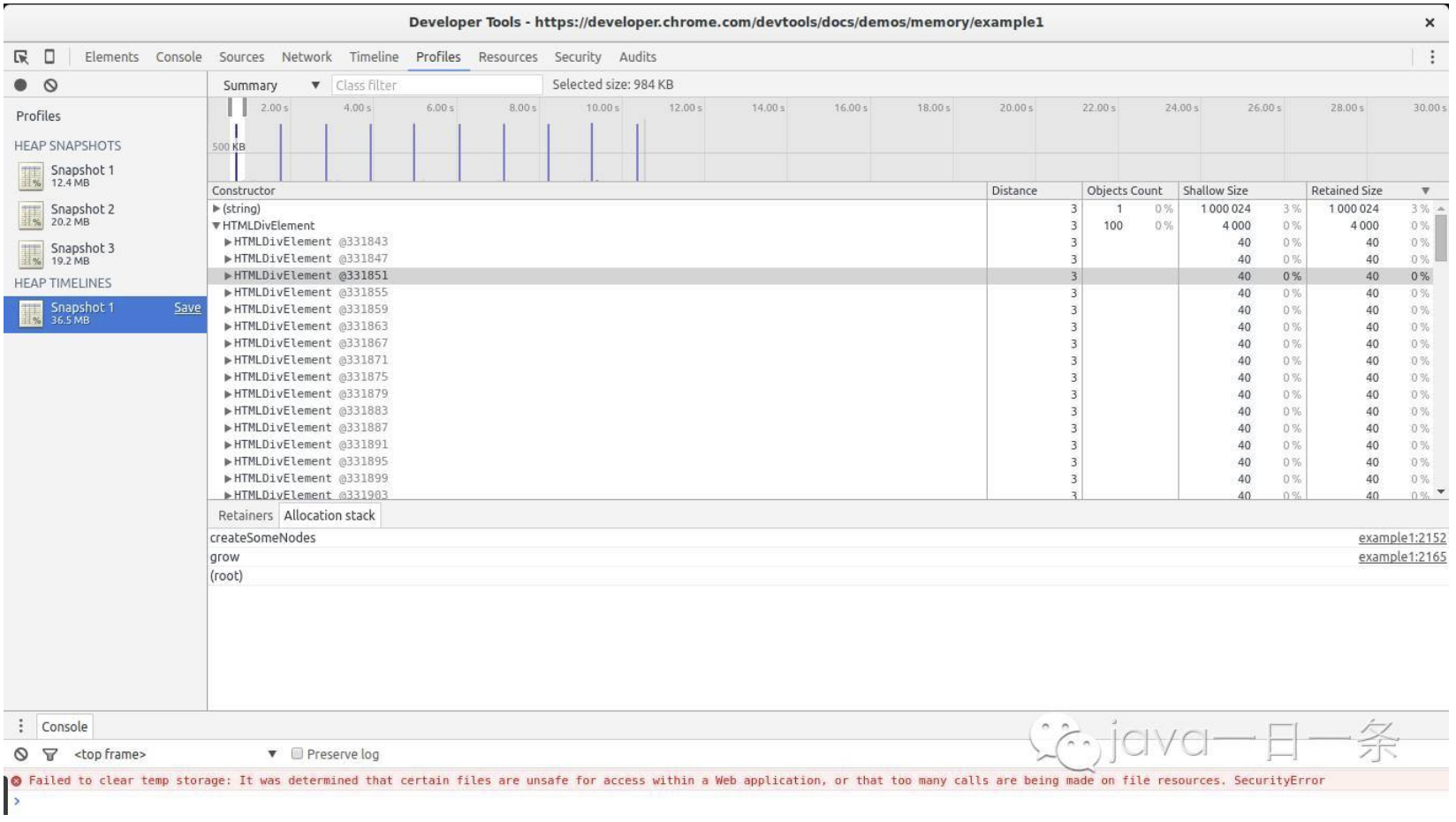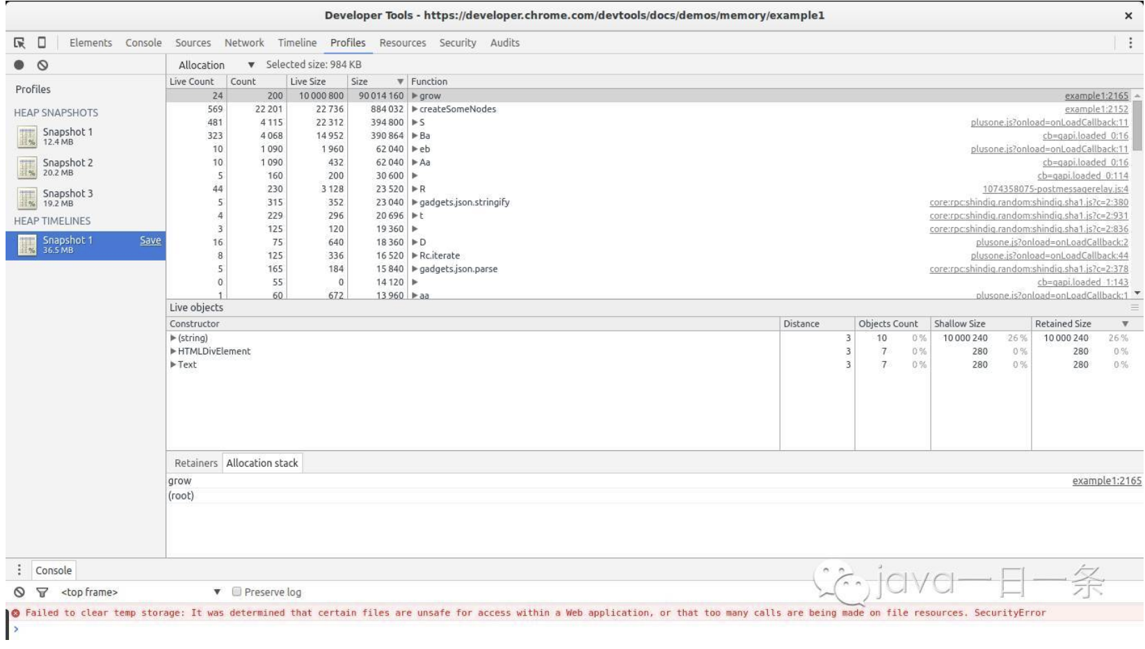 这个视图呈现了内存分配相关的功能列表,我们立刻看到了 grow 和 createSomeNodes。当选择 grow 时,看看相关的 object constructor,清楚地看到 (string), HTMLDivElement 和 Text 泄露了。