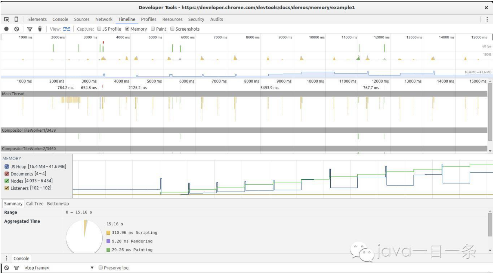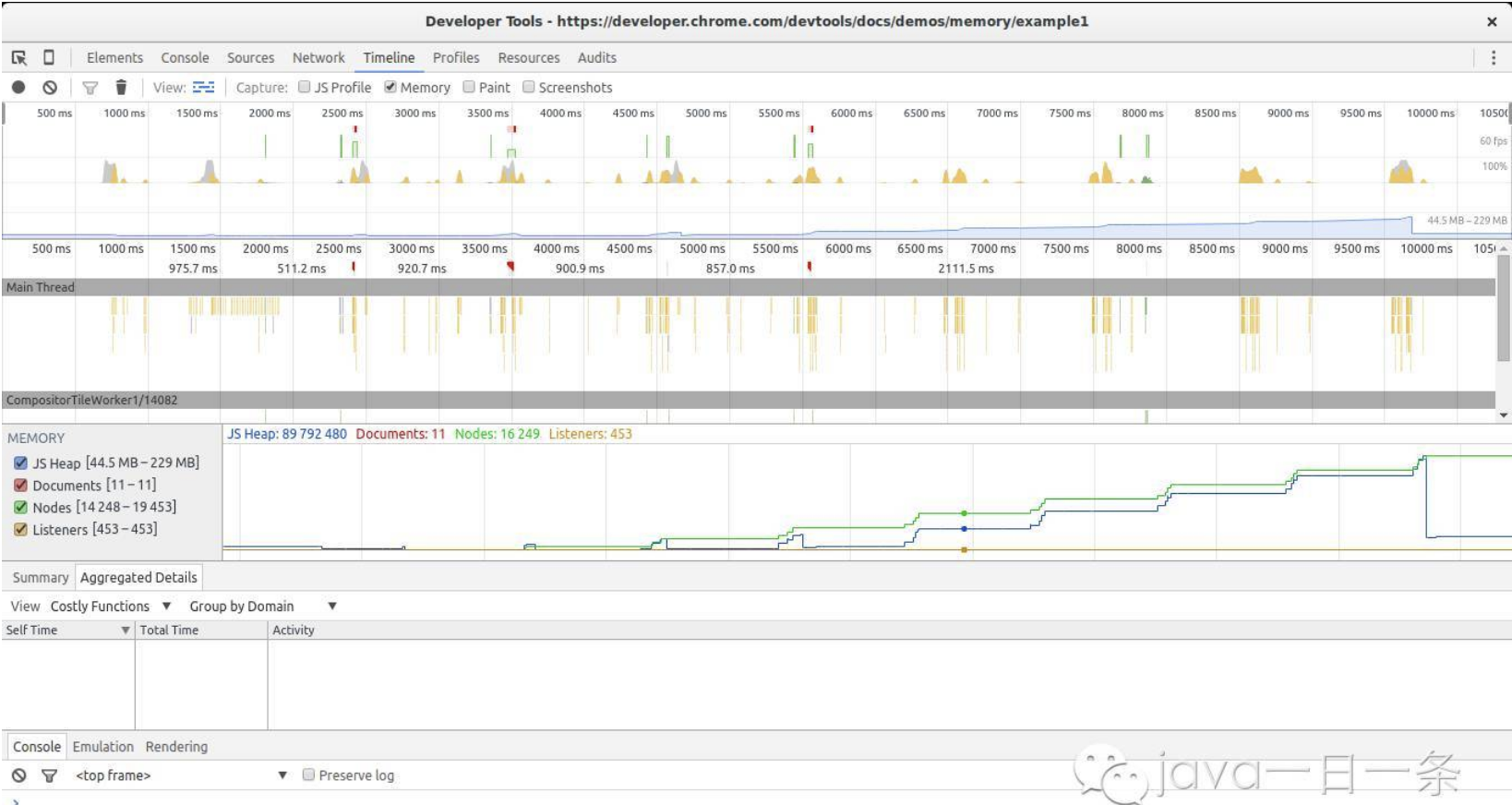 timeline 可以检测代码中不需要的内存。在此截图中,我们可以看到潜在的泄露对象稳定的增长,数据采集快结束时,内存占用明显高于采集初期,Node(节点)的总量也很高。种种迹象表明,代码中存在 DOM 节点泄露的情况。