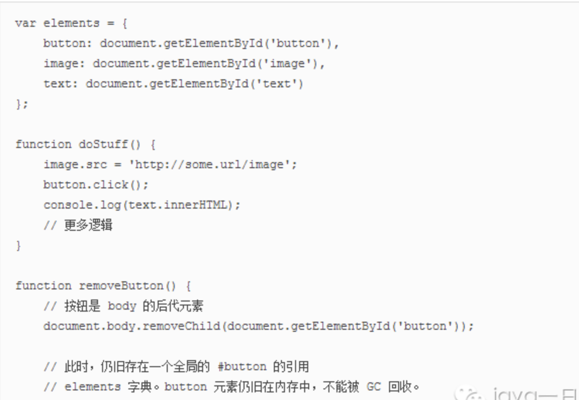 此外还要考虑 DOM 树内部或子节点的引用问题。假如你的 JavaScript 代码中保存了表格某一个 <td> 的引用。将来决定删除整个表格的时候,直觉认为 GC 会回收除了已保存的 <td> 以外的其它节点。实际情况并非如此:此<td> 是表格的子节点,子元素与父元素是引用关系。由于代码保留了 <td> 的引用,导致整个表格仍待在内存中。保存 DOM 元素引用的时候,要小心谨慎。