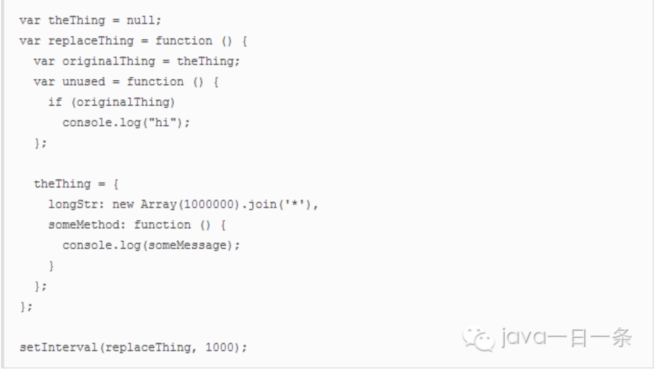 代码片段做了一件事情:每次调用 replaceThing ,theThing 得到一个包含一个大数组和一个新闭包(someMethod)的新对象。同时,变量 unused 是一个引用 originalThing 的闭包(先前的 replaceThing 又调用了 theThing )。思绪混乱了吗?最重要的事情是,闭包的作用域一旦创建,它们有同样的父级作用域,作用域是共享的。someMethod 可以通过 theThing 使用,someMethod 与 unused 分享闭包作用域,尽管 unused从未使用,它引用的 originalThing 迫使它保留在内存中(防止被回收)。当这段代码反复运行,就会看到内存占用不断上升,垃圾回收器(GC)并无法降低内存占用。本质上,闭包的链表已经创建,每一个闭包作用域携带一个指向大数组的间接的引用,造成严重的内存泄露。
