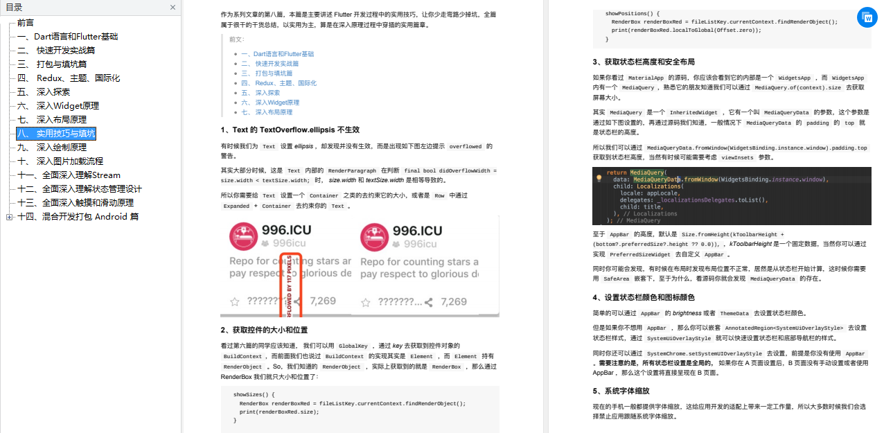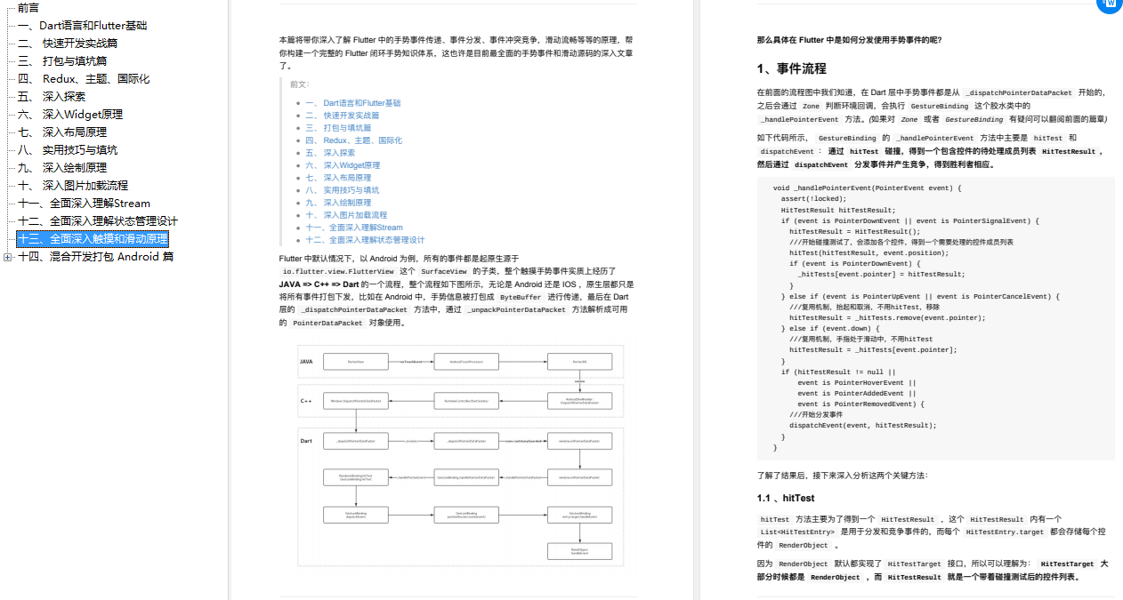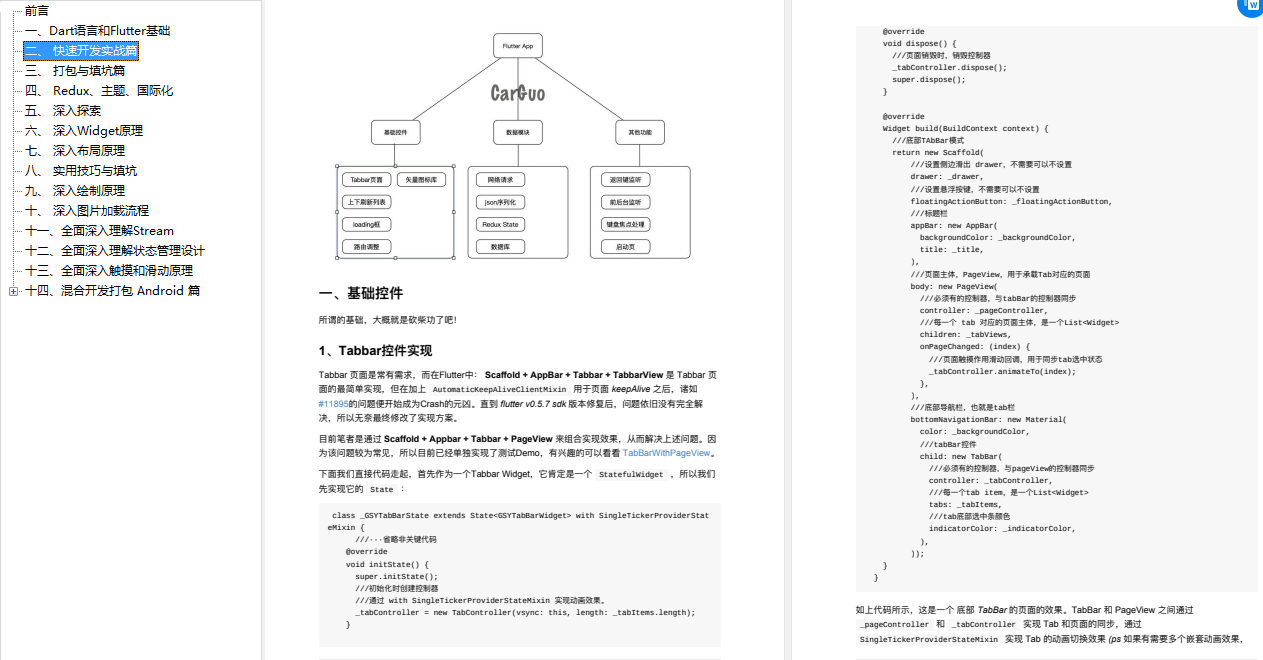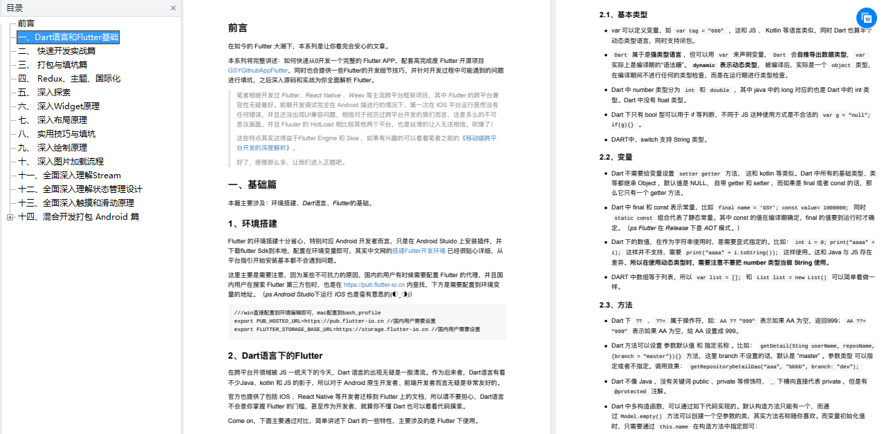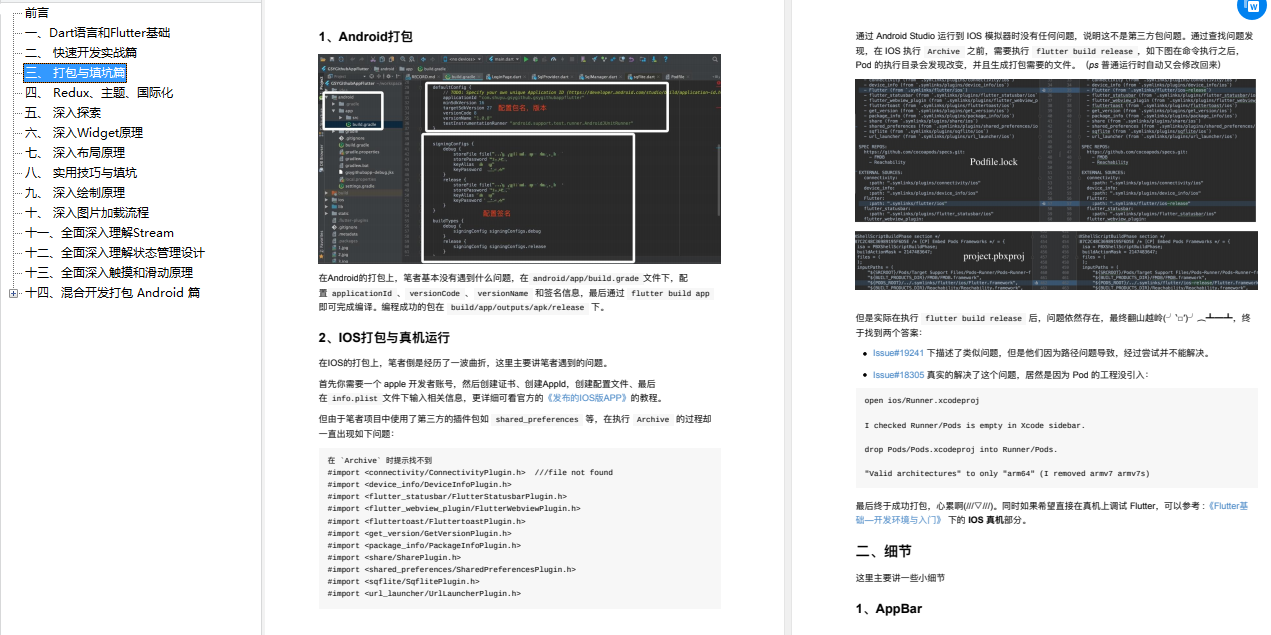 这里给大家分享一份《Flutter完整开发实战详解手册》,这份手册采用由浅入深的方式介绍 Flutter 技术原理,内容分为十四个章节。