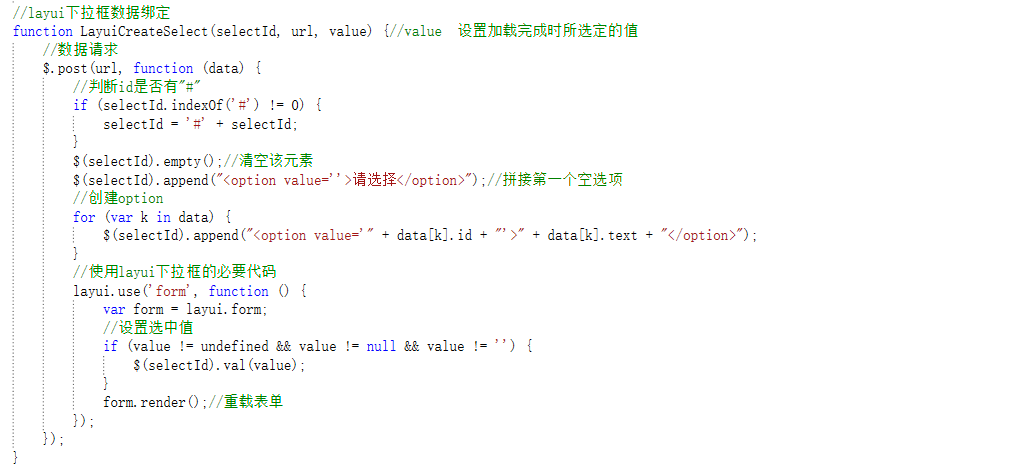 方法的参数一般有三个,一个是select标签的id,一个是查询数据的路径,还有一个是可有可无的选中值。其实方法里面就是由一个post请求构成的,构建一个动态下拉框大致分为两步,第一步请求数据,第二步把查询到的数据拼接到下拉框里。