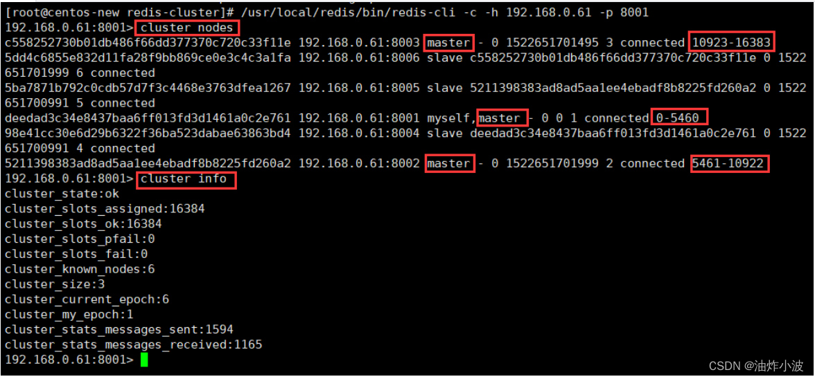 /usr/local/redis‐5.0.3/src/redis‐server /usr/local/redis‐cluster/8006/redis.conf查看集群状态:cluster nodes